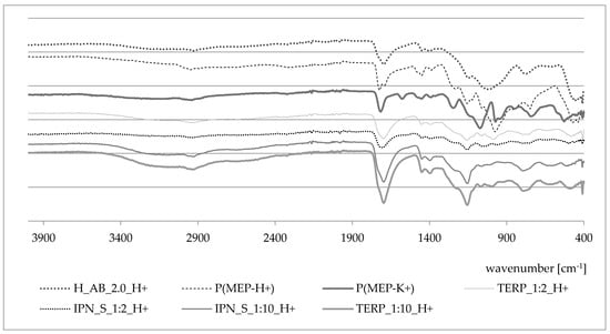 FTIR spectra are presented in Figure 9. The spectra of PMEP have been described in detail by L. Grøndahl et al. [36]. In Figure 9, the P(MEP-H+) spectrum is presented (-P-OH—974 cm−1, -P-OC—1057 cm−1, -CH2—1452 cm−1), as well as those of P(MEP-K+) and H_AB_2.0. The change in the ionic form of PMEP slightly affected the position of particular peaks. The -C = O peak oscillates in the ~1700 cm−1 region. Spectra of obtained IPNs and their compositional analogs show no significant differences compared to the expectations.