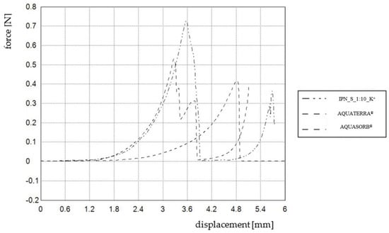 Concerning improvement, it is worth paying special attention to maximal hardness values—Hmax of IPN_S_1:10_K+ is 38.5% higher than that of AQUATERRA®. Charts obtained during the compression tests presenting the highest hardness values are shown in Figure 10. Moreover, the compression test was also performed for IPN_S_1:8_K+ based on its very promising swelling performance. The results show that incorporating more phosphate units may significantly improve mechanical properties—the maximal observed hardness was 1.84 N, Hmin = 0.19 N, while swelling properties were still good and sufficient for agricultural purposes [52].