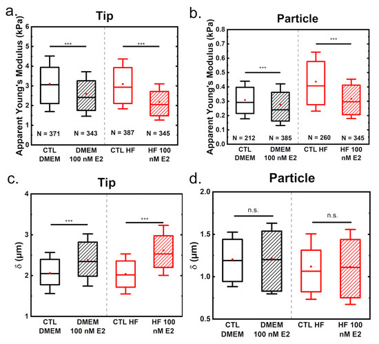 Influence of estrogen on the mechanical properties (apparent Young’s modulus for tips in (a) and particles in (b), and indentations at a force of 2 nN in (c) for tips and (d) for particles) for measurements performed with either tips or particles. An indentation depth of 500 nm was evaluated for Young’s modulus determination. N indicates the number of measurements considered. The boxplots indicate the data from the 25th to the 75th quantile, with the whisker being 1× the standard deviation, the red dot the mean value and the line in the middle the median. Statistical significances are reported as *** for p < 0.001.