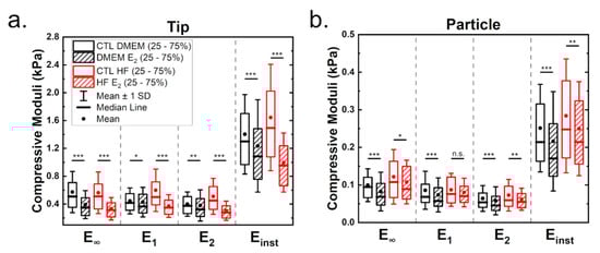 Figure 3 shows the influence of estrogen on the viscoelastic properties of MCF-7 cells measured either with tips (a) or with particles (b). Table 1 shows the derived statistical values (full statistical analysis can be found in the Supplementary Materials). As before, moduli estimated from the tip measurements are higher than those for particle measurements. Cells cultured under hormone-free conditions showed increased moduli values (Figure 3a,b). Treatment with estrogen led to a significant reduction of viscoelasticity in both media, which was strongest in cells cultured with HF medium.