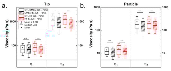 Finally, viscosities were derived from the relaxation times obtained from the fittings and the viscoelastic moduli. Two distinctive relaxation times, one in the range of a few hundred milliseconds and one of a few seconds were determined, as described in prior work [31]. In literature, the presence of two relaxation times is thought to originate from different structures inside the cell, and the larger is normally connected to the cytoskeleton. Table 1 as well as Figure 4 show the determined viscosity values. Values were approximately five times higher when calculated for tips than for particles (Table 1). This difference is due to multiple reasons; on the one hand, the tip has a smaller contact area than the particle, thus less cell volume is deformed. On the other hand, respective indentations at the same force differ (2 µm for the tip and 1.25 µm for the particle), presumably due to probing different cell compartments. Viscosity in cells cultured in DMEM, when measured with tip, was hardly affected by estrogen addition (Figure 4a). In contrast, the viscosity of cells grown in hormone-free medium was strongly reduced by estrogen addition. Both viscosities are significantly smaller for measurements performed with particles after estrogen supplementation, irrespective of medium (Figure 4b). The viscosities are in range with those reported for cells in literature [20,31,33,48].