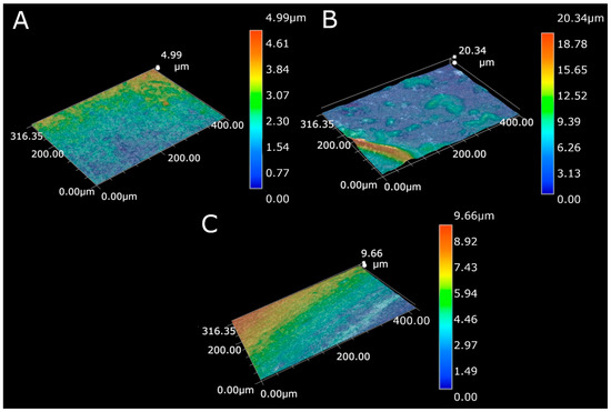 To study the surface topography, the optical microscope (VHX Keyence, Keyence International (Belgium) NV/SA, Mechelen, Belgium) was used. The average roughness index Sa values were estimated based on 512 lines made in the area of approximately 150 μm × 140 μm.