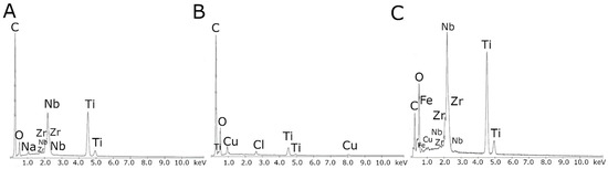 EDS spectra of the (A) MWCNTs reference coating, (B) MWCNTs/TiO2 bi-layer coating, (C) MWCNTs_Cu dispersion coating.