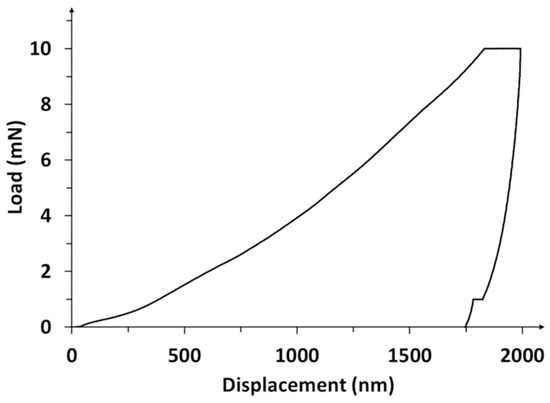 The load–displacement hysteresis curve, as an example of the results of nanoindentation tests, is shown in Figure 5. Three stages of the nanoindentation test can be distinguished in the graph: raising the load until maximum value, a pause (to stabilize the probe at maximum depth), and offloading. Due to temperature drift, an irregularity in the form of the stage can be observed. The drift is adjusted at the end of nanoindentation.