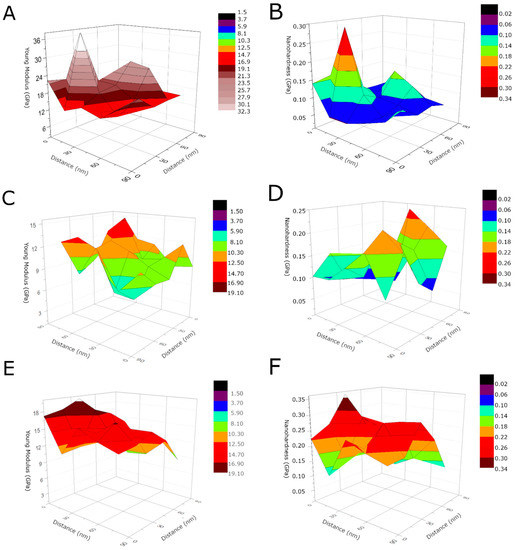 3D Young’s modulus and nanohardness distribution for the MWCNTs sample (A,B), the MWCNTs/TiO2 coating (C,D), the MWCNTs_Cu coating (E,F), respectively.