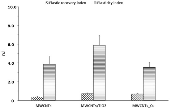 Further crucial parameters are the ratio of the nanohardness to elastic modulus (H/Er), which shows the endurance capability of a surface coating, especially its ability to accommodate substrate deflections under load [103], and the yield pressure (H3/Er2), used to evaluate the resistance to plastic deformation of materials under nanoindenter tip load [56]. The H/Er and H3/Er2 parameters for the MWCNTs sample, the MWCNTs/TiO2 bi-layer, and the MWCNTs_Cu dispersion coating, examined under indentation load of 10 mN are shown in Figure 8. The addition to the MWCNTs coating-based Ti13Nb13Zr substrate, several nanoCu or TiO2 particles improves the wear resistance under surface deflections and the resistance to plastic deformation under applied load [86]. This means that the higher the H3/Er2 parameter is, the higher the fraction of plastic work during stress applying on coating surface should be. Conversely, the diagram showed in Figure 8 demonstrates the lowest PI for the MWCNTs_Cu dispersion coating, what indicates the release of energy dissipated in the coating under nanoindenter tip load and explains the appearance of the cracks shown in Figure 2.