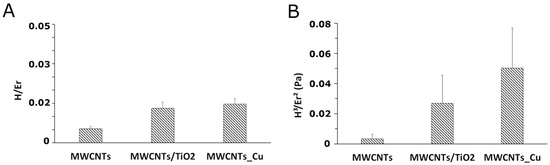The diagrams for the H/Er (A) and the H3/Er2 parameter (B) calculated for the MWCNTs bi-layer and the MWCNTs_Cu dispersion coating, examined under indentation load of 10 mN.