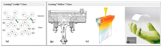 Corning® keeps leading innovation in high-tech glass materials: (a) Corning® Gorilla® Glass fabrication technic; (b–d) Corning® Willow® Glass, (b)—down-draw fabrication process, (c)—overflow fabrication process, and (d)—Flexible Corning® Willow® Glass product. ((b)—reprinted from [14] © (2010) with permission from Wiley; (c)—reprinted (adapted) with permission from [15] © (2016) American Chemical Society; (d)—reprinted from [16] © 2021 with permission from Wiley).
