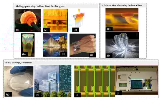 Examples of different glass fabrication methodologies. Melting-quenching: (a) glassblowing; (b) Lalique glass; (c) float chamber, credits by Saint-Gobain® Glass Portugal; (d) Louvre Museum entrance, Saint-Gobain®; (e) overflow fabrication process (reprinted (adapted) with permission from [15] © (2016) American Chemical Society); (f) Apple® Willow® glass watch; coatings and substrates; (g) SiO2/TiO2 Sol-gel coating on a standard glass substrate; (h) coated glass, Saint-Gobain, Paris, Valode & Pistre Architects, credits by Saint-Gobain® Glass Portugal; (i,j) TFT backplane fabricated on flexible glass and flexible glass AMLCD prototype (reprinted from [75] © 2021 with permission from IEEE; Additive Manufacturing—Hollow Glass); (k) glass 3-D printing process by Steven Keating, MIT CC BY-NC-ND 3.0 available at [74], (l) by Andy Ryan, MIT CC BY-NC-ND 3.0 available at [74].