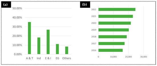 Soft magnetic materials (a) world market share (2016). A&T—automotive and transportation; Ind—industrial; E & I—electronics and instrumentation; EG—energy generation. (b) Market transactions and predictions (in USD billion) (based on images from [77]).