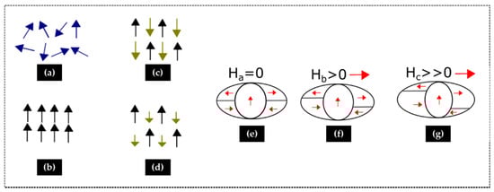 Magnetic interactions: (a) paramagnetic, (b) ferromagnetic, (c) antiferromagnetic, and (d) ferrimagnetic. Scheme of domains growing in a ferromagnet at: (e) zero magnetic field; (f) weak magnetic field; (g) strong magnetic field.