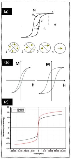 Hysteresis loop and domain growth of: (a) ferromagnet; (b) soft and hard magnetic materials hysteresis loop, respectively; (c) magnetic field dependence of the magnetization of a superparamagnet (reprinted from [78] ©2011 with permission from Elsevier).