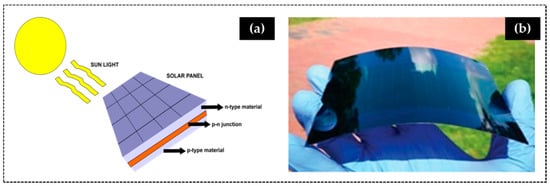 (a) Schematic of operation of a solar panel and (b) a solar cell produced with Corning® Willow® Glass (reprinted from [115] © 2021 with permission from Willey).