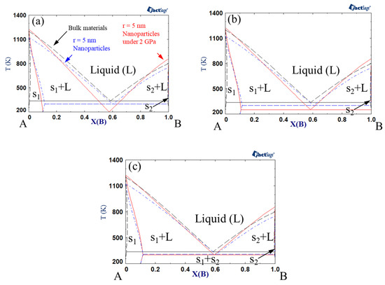 Phase diagrams were calculated by Gibbs energy minimization with FactSage software [68,69]. Figure 1 shows the phase diagrams of bulk material, nanoparticles, and nanoparticles under a pressure of 2 GPa. Here, the interaction parameter of bulk solid under atmospheric pressure was +15 kJ mol−1, whereas that of bulk liquid under atmospheric pressure was −15 kJ mol−1. The interaction parameter could be modified by a size effect or pressure effect. The size of each nanoparticle was assumed to be r = 5 nm. The excess volume parameter for liquid () varied between −10−6, 0, and +10−6 m3 mol−1. Notably, the melting points of the pure substances (A and B) decreased for nanoparticles vs. bulk material, while it increased when high pressure was applied to the nanoparticles. On the other hand, the eutectic point decreased for nanoparticles, and it decreased further when high pressure was applied to the system. The extent of the reduction in the eutectic temperature became greater when the excess volume parameter was negative. Makov et al. demonstrated that the eutectic temperature of bulk binary alloys decreases as the solid interaction parameter increases or the liquid interaction parameter decreases [66]. The same authors also found that the effects of positive and negative excess volumes at high pressure correspond to the increase and decrease in the interaction parameters, respectively. Since the excess volume of the solid is negligible compared to that of the liquid, a negative excess volume of liquid in the present study results in the same effect as a decrease in the liquid interaction parameter. Consequently, the eutectic temperature of the nanoparticles decreased with increasing pressure.