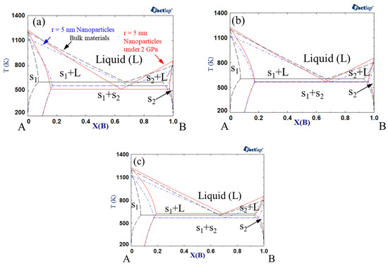 A–B phase diagram of each case (black dashed line indicates bulk material; blue dash-dotted line indicates 5 nm radius nanoparticles, red solid line indicates 5 nm radius nanoparticles under 2 GPa): Ωs = 15 kJ/mol, ΩL = −15 kJ/mol, (a) VEx = −1 cm3/mol, (b) VEx = 0 cm/mol, (c) VEx = 1 cm3/mol.