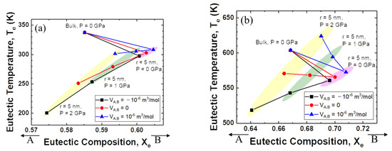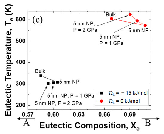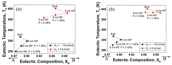 Figure 3a shows the relationship between eutectic composition and eutectic temperature when the interaction parameter of the solid is +15 kJ mol−1 and that of the liquid is −15 kJ mol−1. For the change from bulk to nanoparticles, the eutectic composition moves to the direction of the low melting temperature element, B. When high pressure is applied, the eutectic composition moves back in the direction of the high melting temperature element, A. The changes in temperature and composition are more significant when the excess volume parameter of the liquid is negative.