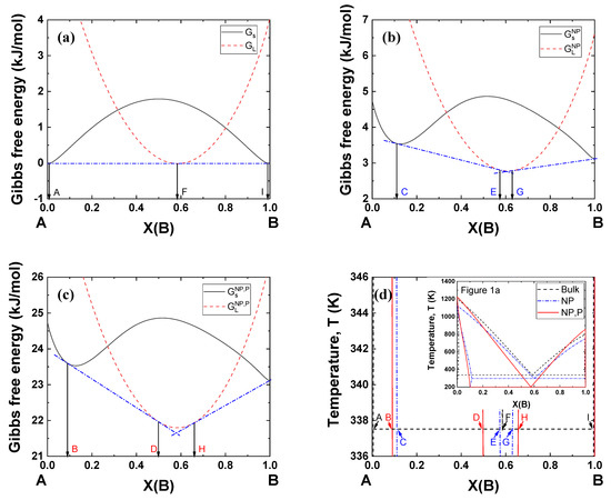 Figure 5 shows typical examples of Gibbs energy curves at 338 K (bulk eutectic temperature under 0 GPa) for the A–B binary system in Figure 1a. Figure 5a shows that a single common tangent line can be drawn passing two contact points on the Gibbs energy of the solid (A and I) and one contact point on the Gibbs energy of the liquid (F, eutectic composition). When the particle size becomes 5 nm, the Gibbs energies of both the solid and liquid move upward, yielding two common tangent lines and a narrow liquid region (E~G) (Figure 5b). When a pressure of 2 GPa is applied to the nanoparticles, the Gibbs energies move to much higher positions, forming a wider liquid region (D–H) (Figure 5c). This simulation methodology can be used to identify nanoparticle systems which can potentially be used under high pressure.
