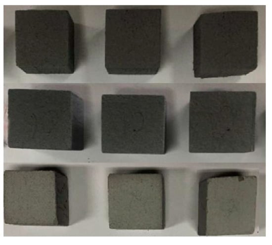 As shown in Table 2, with the 73.86% of SiO2, 3.16% of Al2O3, and 2.72% of CaO, the main component of the LRT was similar to the construction materials. The contents of the targeted major metals such as Cu, Zn, Fe, and Mn were 2923 g/t, 1638 g/t, 108,671 g/t, and 591 g/t, respectively. The content of Na and K were lower than 0.2%, and S was mainly in the presence of sulfate; thus, the cracking risks caused by the dissolved salt and acidity will be reduced [18]. When the firing process was used, the available sulfur was easily turned to the notorious SO2 [18]; therefore, this study planned to use curing methods to prepare building specimens.