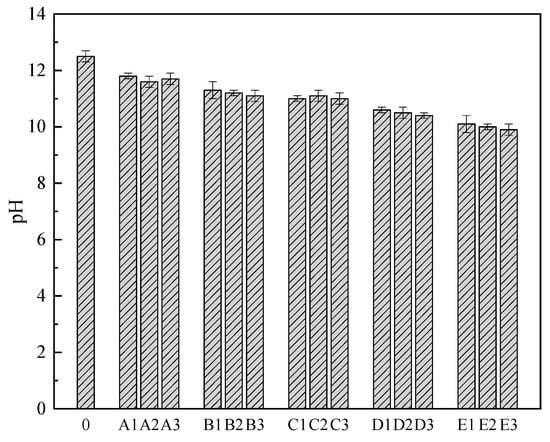 The pH values of hardened samples aged 28 days were measured, and the results were shown in Figure 2. The pH values were measured to be in the range of 9.99–12.52 and found to decrease with the increase in the LRT ratio. The slightly decreased pH value may be associated with the increased addition of LRT and other acidic components, which tends to reduce the strength properties of geopolymer binders [22]. In previous research, the polymerization process was best initiated at a high pH value, and the precipitation of portlandite may take place at a pH range of 9.5–12.97 [22]. Therefore, the LRT reaction with FA/OPC systems, which are synthesized under high alkaline concentration, results in a stable microstructure in the construction material.
