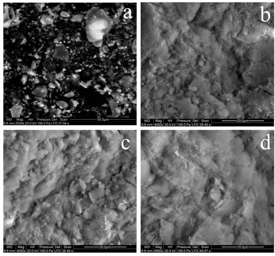 The microstructures of LRT and specimens with 47% LRT added (C1) after 3, 7, and 28 days of curing are shown in Figure 3. The fracture of the polyester mortars is almost always caused by the failure of the fine aggregate [32], regardless of the type of filler. The particle size distribution had a significant relationship with the mechanical strength of the concrete [33], and the particle size of the leaching residue was relatively small when compared with tailings used in other research [34]. Moreover, the calcium sulfate contents of the leaching residue were obviously higher after the H2SO4 leaching process, an amorphous C–S–H gel coated the surface of the dehydrated grain, and the particles of the fillers and fine aggregates were sufficiently covered with a hardened polyester resin as a binder. It is evident that there was a high adhesion between the fillers or fine aggregate, and a polyester resin had developed. The hydrated product presented a denser structure and lower porosity after a longer curing time.