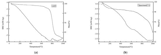 Thermal stability is an important indicator for the use of building materials. The TG analysis for the LRT and also the specimen (C1) are shown in Figure 4. When the temperature ascended to 1000 °C, the weight loss of LRT could reach 17.9%. There were exothermic peaks in the two temperature ranges of 760–820 °C and 930 °C–1000 °C, respectively. These two exothermic peaks correspond to a weight loss of 15.2%; the loss was caused by mineral decomposition and the gaseous substance produced.