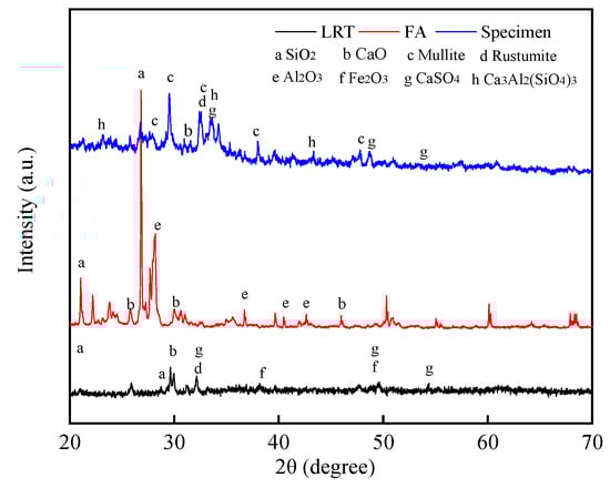 The XRD comparison analysis was shown in Figure 5. It can be found that after curing, the main proportion of SiO2 in the LRT was converted into more stable minerals such as CaAl2 (SiO3)4 and Mullite. Thus, the good stability of the specimen could be obtained [18,36]. The solidified hydration reaction mixes the calcite with the partially crystalline gel, resulting in the coexistence of the amorphous phase and the crystalline phase of the hydrated product. This plays a crucial role in combining non-reactive and partially reactive particles to form a denser structure.