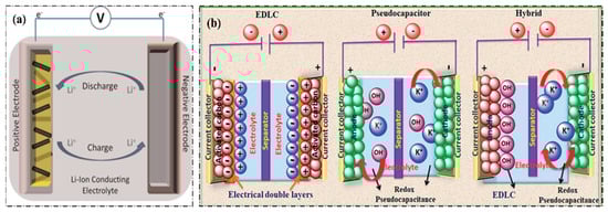 With the remarkable development of low-cost, lightweight, portable electronic devices, electrical vehicles, aerospace and medical systems in our daily lives, the demand for a sustainable energy supply is becoming one of the greatest challenges for the whole world [,,,]. In the search for advanced sustainable energy sources, the urgent development of long-term high-efficient high energy-power resources is required. Electrochemical energy storage (EES) systems such as batteries and supercapacitors are promising for reaching the required demands due to their fast charge–discharge rates, high power ability, long cycle life for supercapacitors and high-rate capability and high energy density for batteries [,]. Among different types of rechargeable batteries, lithium-ion (Li-ion) batteries have been considered as one of the most promising EES sources on the market since 1991. The charge storage mechanism of Li-ion batteries is mainly based on intercalation/deintercalation of Li-ion between cathode and anode electrodes separated by an electrolyte (Figure 1a). Li-ions move from cathode to anode via electrolyte to store energy during charging and move back to the cathode to release energy during discharging of the Li-ion battery. The movement of Li-ions is facilitated by an electrolyte, which usually contains a highly flammable and volatile solvent. Therefore, safety is a great issue for Li-ion batteries due to thermal instability, leakage possibility, internal short circuit, and the flammability of electrolytes [,]. On the other hand, supercapacitors (SCs) draw a lot of interest due to their high-power densities, rapid charge–discharge capability, long cycle lives and, most importantly, safety, which make their use in promising high performance energy storage devices [,,,]. Depending on the charge storage mechanism, SCs can be categorized into three types, i.e., electrical double-layer capacitors (EDLCs), pseudocapacitors and hybrid supercapacitors (Figure 1b). EDLCs can store energy by a non-Faradic process, i.e., charges are accumulated at the electrode/electrolyte interface in the form of an electric double layer. Carbon-based materials such as carbon nanotube (CNT), activated carbon (AC), graphene, carbon aerogel, etc., are used as EDLC electrode materials due to their high specific surface area, high electrical conductivity and porous structure [,]. Still, EDLCs are unable to exhibit high specific capacitance (Csp) and high energy density according to the market requirements. On the contrary, different types of binary, ternary transition metal oxides (TMOs) (RuO2, NiO, Fe2O3, MnO2, CoOx, NiMnO2, Co3O4, MnFe2O4, etc.), conducting polymers (CPs) (polyaniline (PANI), polypyrrole (PPy) and poly(3,4-ethylenedioxythiophene) (PEDOT), etc.) and their composites (NiO-CNT, V2O5-PANI, PANI-CNT, NiMn2O4-Graphene, etc.) are usually used as pseudocapacitive electrode materials [,,,,]. Pseudocapacitor electrodes can store energy via reversible faradic redox reactions or ion intercalation into layered structures of electrodes at the electrode/electrolyte interface, and they can reach high specific capacitance and energy density compared to EDLCs [,,]. Hybrid supercapacitors can store charge in the combination of EDL and redox reactions. SCs, however, can deliver high specific capacitance, high power and energy density but poor rate capability, lower electrochemically stable potential windows, lower thermal stability as well as poor charge–discharge stability due to low electrical conductivity and degradation of electrode materials during long cycle life, hinder their market application as energy storage systems (ESSs) [,].