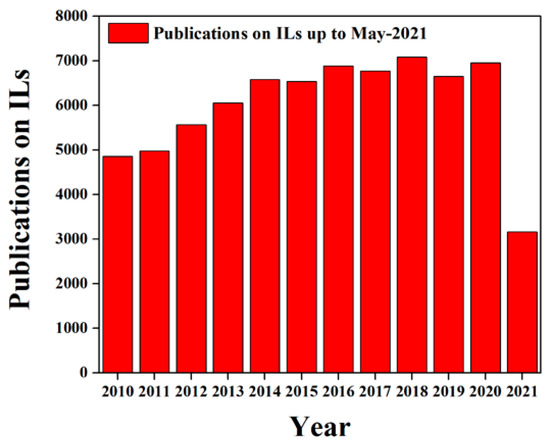 The number of publications in the area of ILs from 2010 to 2021 (All data are recorded from “Scopus” up to 22nd of May 2021).