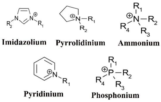 The properties of ILs as electrolytes for Li-ion batteries and supercapacitors plays an important role in regulating the overall electrochemical performance of energy storage systems (ESSs). RTILs have drawn a lot of efforts for ESSs due to their high ionic conductivity, non-flammability and wide potential windows. The tunability of groupings of cations–anions, as well as the chance of achieving changes of cation–anion combinations, extends access to targeted ILs. This has led to a significant expansion in the development of a number of new interesting ILs for the next generation ESSs. Based on cationic salt components, different types of ILs for energy storage device applications have been discussed below [,,,].
