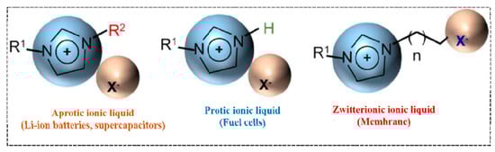 Based on their chemical structure, ILs are mainly divided into three categories such as aprotic, protic and zwitterionic ILs (Figure 4) []. Aprotic and protic ILs both exhibit almost all the above-mentioned properties, but the main difference between these two ILs exists in the presence of a free proton or available proton on the cation of protic type ILs. Aprotic type ILs exhibit wide, stable electrochemical potential windows that make them suitable as electrolytes for supercapacitors and Li-ion batteries. Protic types ILs are used in fuel cells, and zwitterionic ILs are usually used as ILs-based membranes.