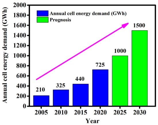 Progress of the rechargeable batteries market as an energy storage system from 2005 to 2030; data recorded from “The Rechargeable Battery Market and Main Trends 2017–2030 (Avicenne Energy, 2019)”.