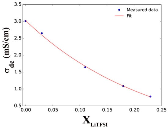 Rothermal, S. and co-workers reported a suitable ILs-based electrolyte mixture Pyr14TFSI-LiTFSI for “dual-graphite” electrode-based LIB cells. This IL-electrolyte exhibits not only high electrochemical stability but also form stable SEI at the graphite anode. The discharge capacity of this cell remarkably increased from 50 mAh/g to 97 mAh/g []. It was also observed that the mixture of two or more different anions could influence the lithiation/delithiation process of Li-ions in LIBs. Onset potentials of anion intercalation can be displayed as TFSI−/FSI− (4.42 V vs. Li/Li+) < TFSI− (4.44 V vs. Li/Li+) < FSI−/TFSI− (4.46 V vs. Li/Li+) < FSI− (4.53 V vs. Li/Li+) []. Balabajew, M. et al. also revealed that the electrolyte acts solely as an ion source and ion transport medium between the anode and cathode for LIBs. They studied the cell performance using Pyr14TFSI with different amounts of LiTFSI electrolyte and observed that the ionic conductivity (σdc) of the electrolyte significantly decreased with the increase in mole fraction of LiTFSI (Figure 6) []. The decrease in ionic conductivity was mainly due to the formation of (Li(TFSI)n)(n−1)− clusters, which enhanced long cycle-life, leading to the diffusion of Li+-ions collectively with the first coordination TFSI--shell. As the number of (Li(TFSI)n)(n−1)− clusters increased, there was an increase in the LiTFSI concentration, which also resulted in the decrease in the diffusion coefficient for Li+ and TFSI−. As a result, the viscosity of these mixtures’ electrolytes increased prominently, and ionic conductivity (σdc) decreased [,]. Marczewski, M.J. et al. proposed a novel electrolyte concept for LIBs, known as the “ionic liquid-in-salt”. Their study on (1−x)EMIMTFSI: (x) LiTFSI, 0.66 ≤ x ≤ 0.97, clearly explained that at superior temperatures, the several dual-liquid and solid-phase regions had been characterized by a wide range of thermal stability, significant mechanical integrity and high ionic conductivity. They had the highest conductivity for the composition x = 0.70 and x = 0.75 (σ ≈ 6 × 10−3 S cm−1) of (1−x)(EMIM)(TFSI): (x) LiTFSI and are associated with the final melting point (at 138 °C and 151 °C, respectively) of the materials. Figure 7 represented that the overall high ionic conductivities are observed for 0.70 < x < 0.90 and lower conductivities for x > 0.90 for the mixtures [].