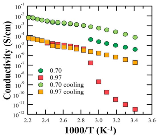 Comparison of ionic conductivities obtained for the LixEMIM(1-x)TFSI (x = 0.70 and x = 0.97) system, data collected during heating and cooling, copyright; Reprinted with permission from Ref. []. Copyright 2014 The Royal Society of Chemistry.