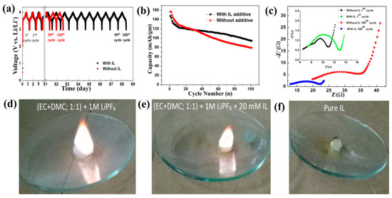 (a) Galvanostatic charging–discharging (GCD) at a constant current (10 mA/g) of the cells with IL (black color) as additive and without IL (red color). The GCD cycles were interrupted when the cell voltage exceeded 4.0 V or dropped below 3.0, respectively. Notice the break plot from 3 to 81 days, (b) discharge capacitance performances of the cell in electrolyte without (red) and with IL (black), (c) electrochemical impedance response after the 1st and 100th cycle of the cell for electrolyte without and with IL additive, flammability test for (d) conventional electrolyte, (e) conventional electrolyte with IL, (f) and pure IL, copyright; Reprinted with permission from Ref. []. Copyright 2020 Springer Nature.