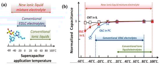 Supercapacitors (SCs) can store energy via redox reaction or the formation of electric double layers (EDLs) of ionic species over the surface of electrodes at the electrode/electrolytes interface. They can reach the global requirements for ESS due to rapid power output, fast charge–discharge ability and longer lifetime than batteries [,,,,]. SCs can be independently used as an alternative renewable energy source in the place of batteries in many fields such as wearable electronics, electric buses, laptops, mobiles, aerospace and various diagnostic instruments in medical systems, which boosts the growing interests in the field of advanced SCs research. The energy density (Ea) is one of the key points that can evaluate the SCs. The low energy density of SCs obstructs its large-scale industrialization. The energy density of SCs is related to voltage window (V), and specific capacitance (C) of the device (Ea = ½ CV2) [,]. As energy density is directly proportional to the square of potential window (V2), then significant improvement can be accomplished by developing new high-capacity electrode materials and/or widening the electrochemical potential window of the SC device. The electrochemical potential window (EPW) of an SC is generally determined by the electrochemical stability of the electrolyte used in the device [,,]. In most cases, the EPW cannot reach higher than 1.0 V for aqueous electrolytes due to the decomposition of water molecules [,]. For organic electrolytes with higher decomposition potential (such as propylene carbonate (PPC), acetonitrile (ACN), etc.), cell voltage can reach up to 2.7 V, but unfortunately, they suffer from toxicity, inflammability and major safety issues [,]. Thus, in developing safe and wide potential electrolytes, compared to aqueous and organic electrolytes, ionic liquids (ILs) have gained a lot of widespread interest in recent years as SCs electrolytes, owing to their many merits such as discrete anion–cation combination, negligible volatility, non-flammability, wide potential window (up to 4.5 V) and with a high ionic conductivity [,,]. A safe, wide range of operational temperatures can also be attained for SCs using ILs as electrolytes. Balducci, A. and co-workers demonstrated and achieved a wide potential window of up to 3.5 V using activated carbon (AC) as the negative electrode, polymethylthiophene as the positive electrode and pyrrolidinium-based IL as the electrolyte. Still, the high viscosity and low ionic conductivity below room temperature of this electrolyte limited the operational temperatures below 50 °C for this SC device [,]. To overcome high viscosity and low conductivity challenges for ILs, it was observed that a suitable nanostructured combination of CNT or graphene-based electrodes and a mixture of ILs electrolytes in an SC could significantly enlarge the operational temperature range and ionic conductivity above room temperature []. Lin, R. et al. revealed that the capacitive energy storage of SCs could be increased from −50 °C to 100 °C (Figure 9a) using ILs electrolytes. The change of capacitance vs. temperature (Figure 9b) for onion-like carbon (OLC) and vertically aligned carbon nanotube array (VA-CNT) electrodes shows that the temperature range was restricted to 110 °C using 1 M tetraethylammonium tetrafluoroborate (TEA-BF4) in PC. This was mainly for the large capacitance drop at low temperatures and for electrolyte oxidation beyond 2.5 V at high temperatures, which was one of the major challenges for commercial SCs. However, the mixture of N-methyl-N-propylpiperidinium bis(fluorosulfonyl)imide (PIP13FSI) and N-butyl-N-methylpyrrolidinium bis(fluorosulfonyl)imide (PYR14FSI) in conjugation with (PIP13FSI)0.5(PYR14FSI)0.5 enhances the wide temperature window of 150 °C [,].