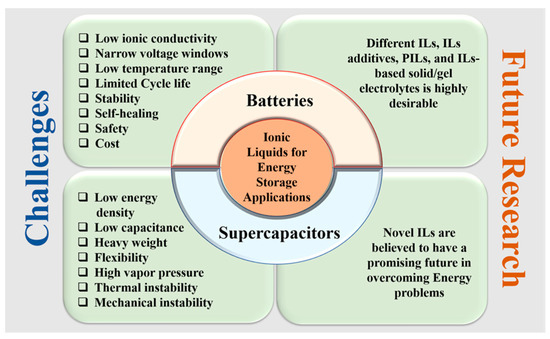 According to the previous research works, ionic liquids (ILs) exhibit tremendous potential in the field of energy storage applications, mainly in LIBs and SCs. ILs are considerably different from conventional organic and aqueous electrolytes. Still, there are some problems in the energy storage mechanism of ILs in LIBs and SCs need to be further addressed (Figure 10). Typical ILs facilitate the widened electrochemical potential windows of LIBs and SCs but sometimes are unable to improve the capacitance due to ions separation difficulties, and this could be one of the crucial objectives for future research. Conversely, there is a fast-growing interest in ESSs in the automotive industry to develop an advanced device that can be operated at a wide range of temperatures as low as −60 °C for military purposes. The degradation of device performance at temperatures below −60 °C for most of the batteries is required to improve. The increase in viscosity of most ILs at lower temperatures deteriorates the charge transportability of the device, and unfortunately, there are very few ILs that can be worked at extremely low temperatures. The fundamental knowledge of ILs as electrolytes needs to be increased for the development of wide temperature, low viscosity, safe and high-voltage ILs for energy storage. A mixture of different types of ILs or the use of ILs as additives with electrolytes, which can reduce the viscosity at low temperatures, could be one solution to migrate the low-temperature problem for LIBs. The mixing of ILs with organic electrolytes can increase the ionic conductivity and operational temperature range for ESSs, but sometimes it can reduce the potential window as well as energy density for LIBs and SCs. Eutectic IL mixtures can be a promising candidate as electrolytes for advanced ESSs over a wide range of operational temperatures owing to their good electrochemical stability and lower viscosity. Newell, R.’s group, discovered a novel eutectic IL mixture of 1-propyl-3-methylpyrrolidinium bis(trifluoromethylsulfonyl)imide with (EMIM)(TFSI), which offered a wide, stable potential of 3.5 V at a wide temperature range (−70 °C to 80 °C) and was favorable for SCs application [,].