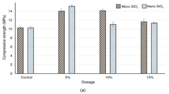 The results from the compressive strength tests are presented in Figure 7. Generally, the compressive strength was higher for mortar samples with micro silica and NS, regardless of the dosage, compared with the compressive strength of the control samples. The highest compressive strength was observed when 5% of NS or micro silica was included in the mixture. However, with the increasing content from 5% to 15% NS, the compressive strength decreased from 15.2 MPa to 11.4 MPa, while the addition of 5% to 15% micro silica decreased the compressive strength from 14.1 MPa to 11.6 MPa. This suggests that NS and micro silica can improve the compressive strength when used at lower proportions and subsequently decrease the compressive strength when increasing their amounts. Overall, the addition of NS appeared to improve the compressive strength better than the micro silica, where a relatively higher compressive strength of 15.2 MPa was achieved with 5% NS [169].