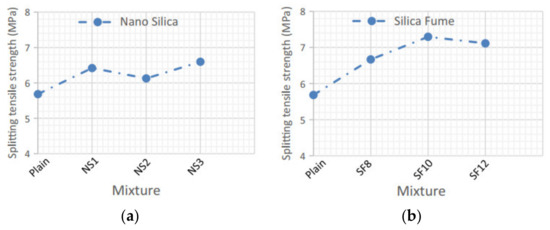 Splitting tensile strength for concrete containing: (a) NS; (b) SF; (c) fibers and NS; and (d) fibers and SF [181].