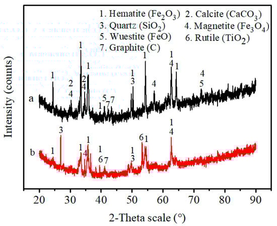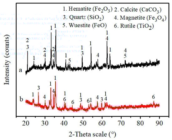 The results for the mineralogical analysis of the mixtures are shown in Figure 14. The main crystalline phases of the mixtures of sample A, binder and water are hematite (Fe2O3), calcite (CaCO3), quartz (SiO2), magnetite (Fe3O4), wuestite (FeO) and graphite (C). The main crystalline phases of the mixtures of sample B, binder and water are hematite (Fe2O3), quartz (SiO2), magnetite (Fe3O4), rutile (TiO2) and graphite (C). Comparing with the results shown in Figure 1, the phase of graphite (C) is present in the results shown in Figure 14 due to the mixture containing binder.