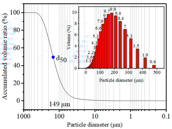 A commercial binder with good performance during the briquetting process was selected. Size distribution of the binder was obtained by using particulate size description analyzer (PSDA, Malvern Mastersizer 2000, Malvern, UK), and the results are shown in Figure 2. It was found that median particle size for the binder was 149 μm, while nearly 50% of binder particles were in the range of 138 to 240 μm. In order to judge whether the binder contains inorganic elements, the binder was heated up to 500 °C for 10 min in a muffle furnace, then the binder ash was collected and analyzed to obtain the composition. The elements of the binder were detected using an organic element analyzer (OEA, Vario Micro cube, Elementar, Hanau, Germany). The elements of binder ash were determined by the XRF analysis.