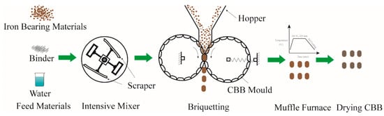 The mixtures containing 88 wt.% iron ore, 3 wt.% binder and 9 wt.% water were obtained by sufficient mixing. A small amount of the mixtures was used to study the bonding mechanism by observing the functional group, phase composition, thermal behavior and microstructure. The remainder of the mixtures was used to prepare the briquette. The spherical-shape briquettes in dimensions of 40 mm × 40 mm × 20 mm (L × W × H) and about 45 g in weight were produced by a twin-roller machine with pressure of 500 kg/cm2. CBBs of samples A and B were labelled as samples AC and BC, respectively. The wet CBBs were dried in a muffle furnace with air as heated medium at 180 °C for 2 h. The process of preparing the CBBs is shown in Figure 3.