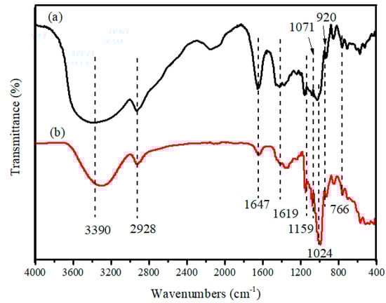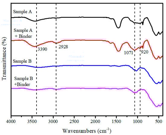 The information about the structure and the nature of the functional groups present in the crystal lattice can be provided by FTIR [24]. An infrared spectrogram of samples A and B with the binder is shown in Figure 12. It can be concluded that chemisorption exists in sample A and does not exist in sample B after adding binder. In the curve of sample A, the characteristic peaks of the binder, e.g., O–H at 3390 and 920 cm−1, C–H at 2928 cm−1 and C–O–C at 1071 cm−1, can be detected on the surface of sample A + binder.