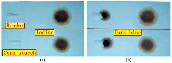 Experiment of binder and corn starch with dilute iodine solution. (a) Brilliant white of binder and corn starch; (b) iodine–binder and iodine-starch staining.