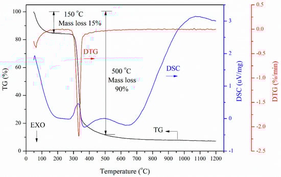 Binder has a great influence on the decrepitation temperature of the CBB [10]. The thermal properties of the binder were characterized by TG, DTG and DSC under N2 atmosphere. The thermograms of the binder are shown in Figure 6. From the TG curve, there are two temperature ranges with large mass loss. The mass loss reaches 15% at 150 °C and 90% at 500 °C. From the DTG plot, it can be observed that the maximum mass loss of the binder is near 340 °C. The mass loss due to the release of volatile matter at near 340 °C and complete release at 500 °C. Furthermore, mass loss of the binder remains stable after 500 °C, and the decomposition of the remaining 10% mass occurs at a very slow rate through the rest temperature range of treatment. There are four endothermic peaks in the DSC curve. The first endothermic peak at 180 °C is due to moisture desorption; the second endothermic peak at 276–361 °C and the third endothermic peak at 372–625 °C correspond to the ash volatilization and the pyrolysis of macromolecular organic matter, respectively. The last endothermic peak observed after 650 °C is caused by the decomposition of materials with high activation energy [17].