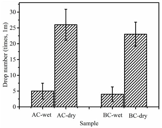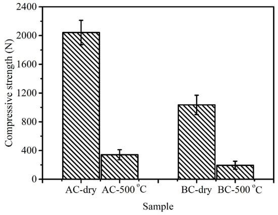 The compressive strengths of samples AC and BC with dry and heat-treated at 500 °C conditions are shown in Figure 9. It can be seen that the compressive strength of the two samples decreases after 30 min at 500 °C in the muffle furnace (air atmosphere). The compressive strength of sample AC heat-treated at 500 °C can reach 341.62 N, which is 16.73% of the compressive strength value of dry sample AC. The compressive strength of sample BC heat-treated at 500 °C can reach 194.65 N, which is 18.80% of dry sample BC. The compressive strength values of heat-treated samples AC and BC are nearly one-fifth of dry samples AC and BC. In addition, it can be inferred from the information provided by Figure 6 that the binder still has a bonding effect after holding CBB at 500 °C for 30 min, while the remaining 10% mass [19], mechanical interlocking force, van der Waals bonding and electrostatic forces, etc., also contribute to the compressive strength of the CBB [20].