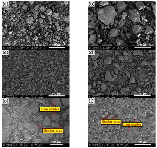 SEM images of (a) iron ore particles of sample A; (b,c) the mixture of sample A, binder and water; (d) iron ore particles of sample B; (e,f) the mixture of sample B, binder and water.