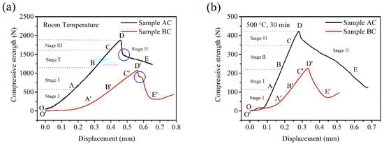 In order to better understand the change characteristics of compressive strength, typical compressive strength curves of two CBBs are shown in Figure 10. The change trend of compressive strength curves of sample AC before and after heat treatment at 500 °C are the same as those of sample BC. Both continuously increase during the process of applying compressive force and then decrease after reaching the peak. There are four characteristic stages in the development of the macroscopic failure process of intact CBBs: stage I: crack closure and elastic stage (OB), stage II: stable crack growth (BC), stage III: initiation of macro-scale shear failure (CD) and stage IV: instability propagation (DE) [21,22]. The difference between the dry and heat-treated sample during the macroscopic failure process is the instability propagation (DE) of stage IV. There is an obvious turning point (as shown in the blue circle in Figure 10a) on the curve; furthermore, there is even a transition platform on sample BC’s curve. However, there is no turning point (as shown in Figure 10b) on the curve. These findings suggest that the bonding strength of the binder decreases after heat treatment, and CBBs will produce more fine particles during the stages of instability propagation (DE). Figure 11 describes the development of the macroscopic failure process of the dry sample and heat-treated sample during the compressive strength test.