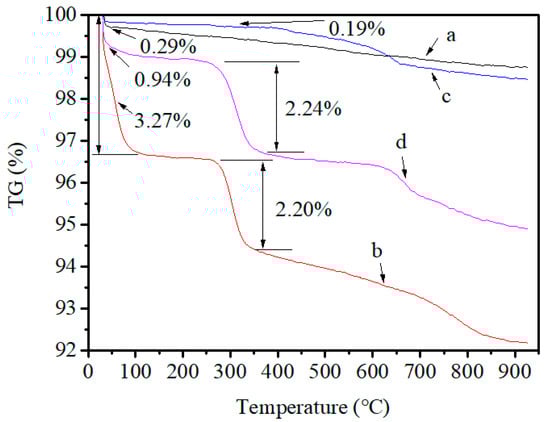 Thermogravimetry (TG) was used to study the thermal behavior of sample A; the mixture of sample A, binder and water; sample B and the mixture of sample B, binder and water. The results of the thermal analyses are shown in Figure 13. The TG curves indicated that four curves have a similar thermal behavior in the temperature range below 100 °C, and the mass loss is related to the evaporation of physically adsorbed water. Figure 13a–d shows mass loss of 0.29%, 3.27%, 0.19% and 0.94%, respectively. The mass loss in b is higher than d, which indicates that b contains more water than d, which may aid bonding. Mass loss at around 300 °C in b and d is due to the binder decomposition and is similar, with values of 2.20% and 2.24%, respectively.