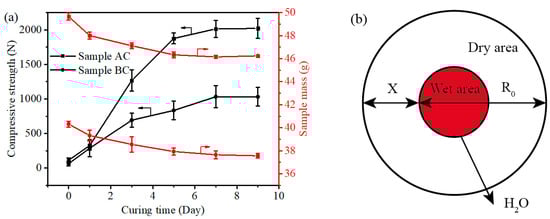 Evolution of compressive strength and the mass of samples AC and BC during the curing process (a) and the model of the curing process (b).