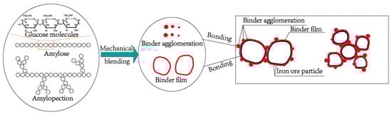 The microstructure and microanalyses of samples AC and BC were obtained by means of SEM-EDS. Figure 17 is an EDS surface scan analysis of samples AC and BC. It can be clearly seen that carbon is mainly distributed around the iron oxide area. There is aggregation of carbon in sample AC and to a lesser extent in sample BC. Combined results of element analysis are presented in Table 2. The carbon in aggregation in sample AC is from raw material due to sample A containing carbon. Because no carbon was found in the raw material of sample BC, carbon in sample BC reflects the distribution of the binder. Moreover, the size of carbon particles in sample BC was less than 0.3 μm. Therefore, it can be inferred that carbon particles with 0.3 μm size in sample AC come from the binder. Carbon particles with 0.3 μm size in samples AC and BC indicate the binder agglomeration and nonuniform distribution. However, binder film covers the particles as shown in Figure 16, and the carbon content is too low to be detected by EDS. The binder exists in film and agglomeration form, and these two forms work together to increase the CBB’s strength. The working mechanism of the binder is summarized in Figure 18. Starch consists of amylose and amylopectin, the normal ratio of which is 27:73%, and the binding power of starch appears to be provided by the amylopectin fraction [25]. The multi-branched structure of amylopectin provides omnibearing adhesion sites [26], thus forming binder agglomeration and film and leading to a strong adhesion between binder and iron ore particles.